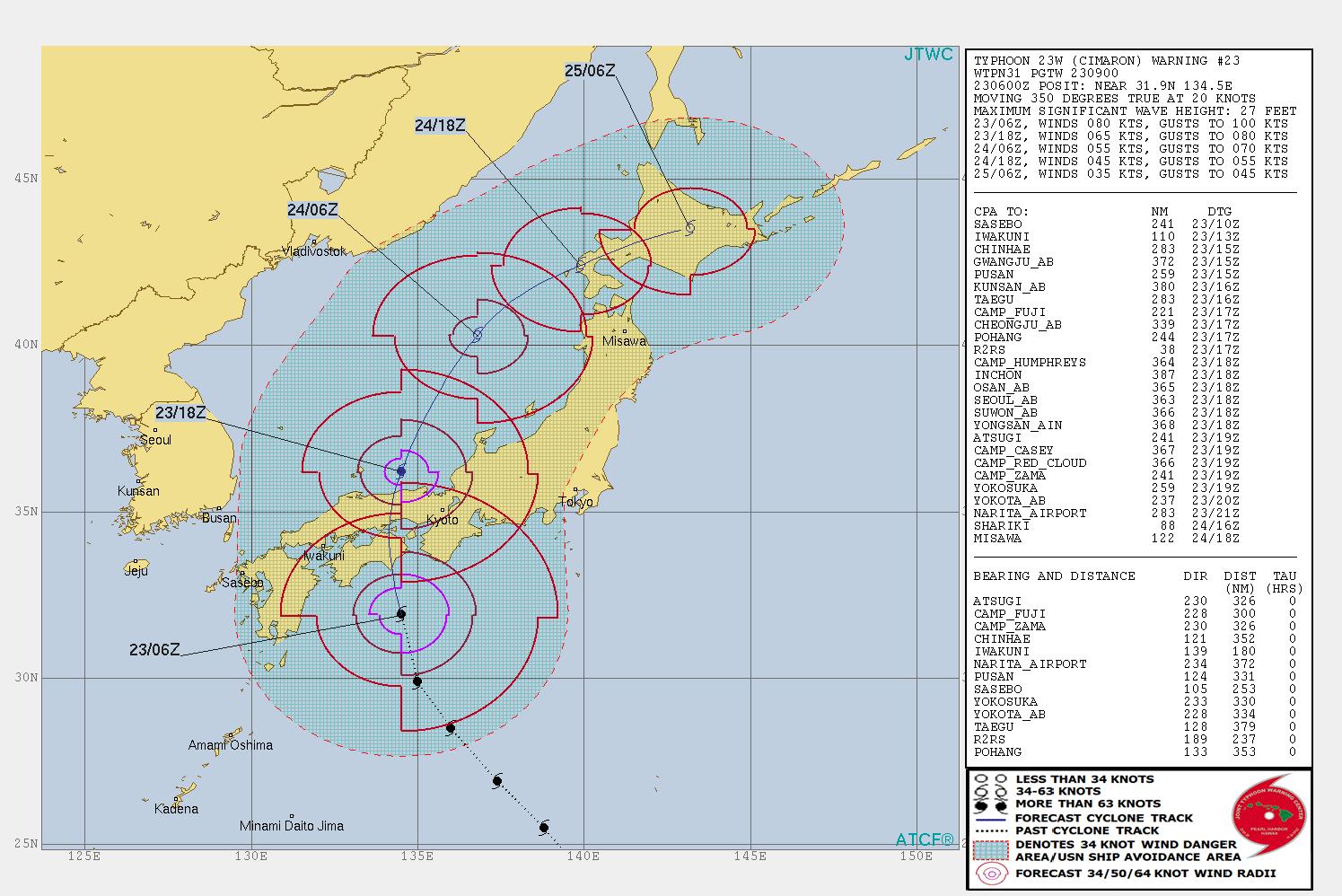 2018年8月23日木曜日14:00時点の米軍最新情報ですが、四国・近畿地方を目がけて北西に進み、中国地方・北陸地方にも影響を与えつつ日本海に抜けると米軍情報ではされていました。