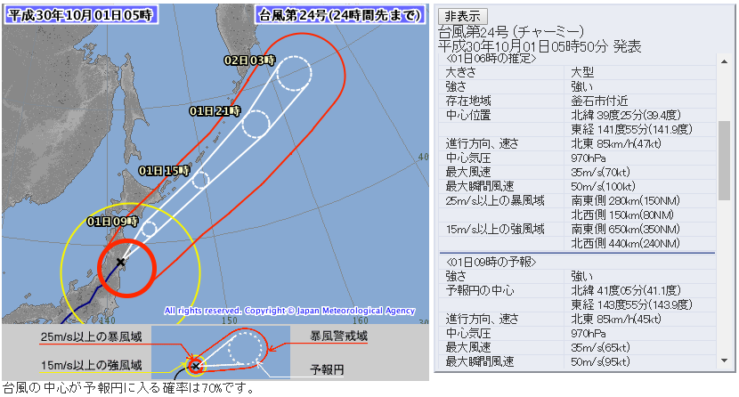 台風24号チャーミーが関東地方に接近するのは10/1(月)朝方と見られており、新幹線への影響がありそうななさそうな微妙な時間帯になりそうな状況でした。