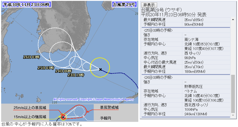 11月に入って台風27号トラジー、台風28号マンニィに続いて台風29号2018で3個目の台風発生となりました。